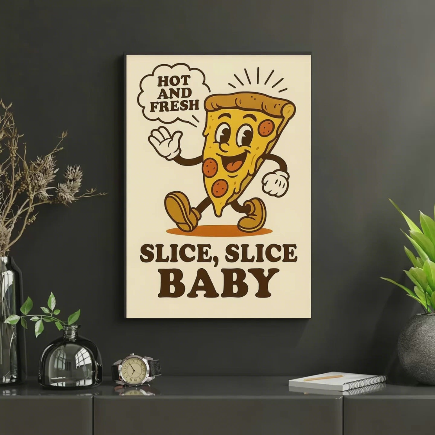 Add a dash of fun to your kitchen with this retro pizza poster featuring a smiling slice and bold vintage typography: “Slice, Slice Baby”. Perfect as kitchen wall art, cafe decor or a gift for pizza lovers.
